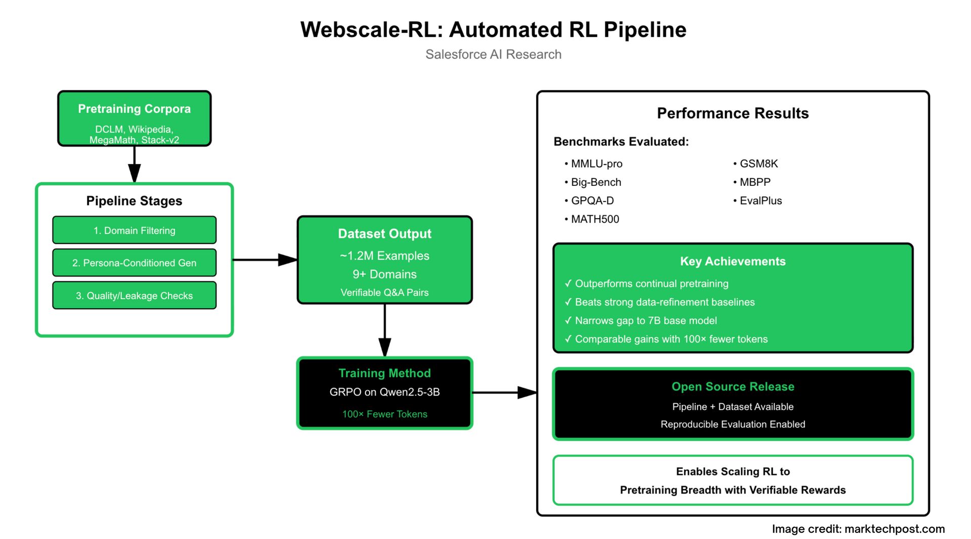 [RL] What if RL had pretraining-scale data? Now it does. Salesforce AI Research has introduced 𝗪𝗲𝗯𝘀𝗰𝗮𝗹𝗲-𝗥𝗟, a highly-scalable synthetic data pipeline and dataset that closes this gap by turning pre-training corpora into diverse RL simulation environments with millions of tasks. Webscale-RL, an automated pipeline that converts pretraining corpora (e.g., DCLM, Wikipedia, MegaMath, Stack-v2) into verifiable RL question–answer pairs via domain filtering, persona-conditioned generation, and multi-stage quality/leakage checks, yielding a ~1.2M-example dataset across 9+ domains. Using GRPO to train Qwen2.5-3B, RL on Webscale-RL outperforms continual pretraining and strong data-refinement baselines on MMLU-pro, Big-Bench, GPQA-D, MATH500, GSM8K, MBPP/EvalPlus, and narrowly closes the gap to the 7B base model, while achieving comparable gains with up to 100× fewer tokens. The pipeline and dataset are released to enable scaling RL to pretraining breadth with verifiable rewards and reproducible evaluation.
